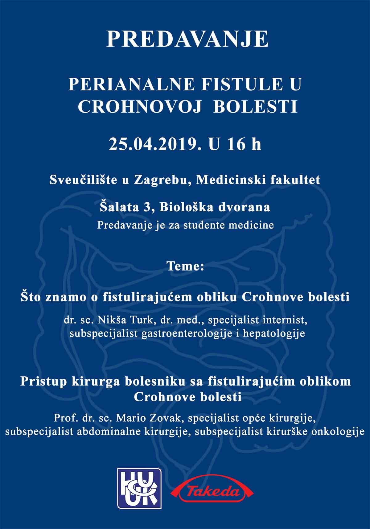 25.04.2019. u 16 sati, na Medicinskom fakultetu, Šalata 3 u biološkoj dvorani, održat će se predavanje na temu Perianalne fistule u Crohnovoj bolesti.